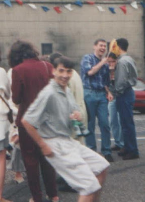 If yuv evir wondert how Lithgi Bistro owner Lorne kin afford ti go fancy hoalidays ti Tuscany n Florence n the like here's the proof yin Fair Day in the mid-nineties. No content wi eatn aw her pieces, he hus jist raided the back press in the scullery i his kindly auld Auntie Bessie fur botils i beer, n quickly makes his exit up the Links ti the Mairchlinds. Sags Binnz n Broon look oan it the tomfoolery, Broon even eggn him oan wi a 'V' fur victory sign. Lorne regularly 'stocks up' the Bistro this wey, indeed his ain gairage is ful i drink he hus nivir bocht, and indeed very rarely is it wastit oan visitors who invite thumsel up fur tea.