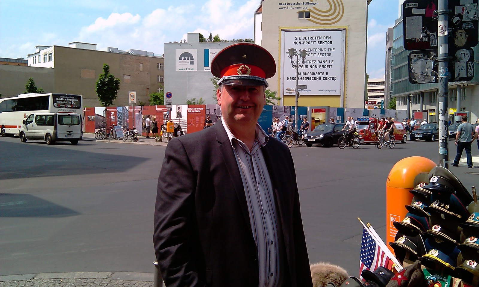 Not So Sags pictured it Checkpoint Charlie in Berlin, whaur he wis attendin the World Paperclip Convention.