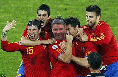 A virtual Stanley Romanov is surroundit bi delightit Spanish players is he is crowned BooB World Cup Sweep wnner 2010.