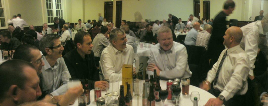 Eftir a fower-course dinner involving Bo'ness Wedding Cake, the BOOBs wur entertained bi speakers Joe Camay, ex-ref John Rowbotham - Wee GC wis in fits i laughter - n John Gagan ably marshalled bi Maistir i Ceremonies Frank McGarry. Bit the nicht wis oanly startin min.