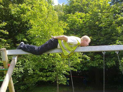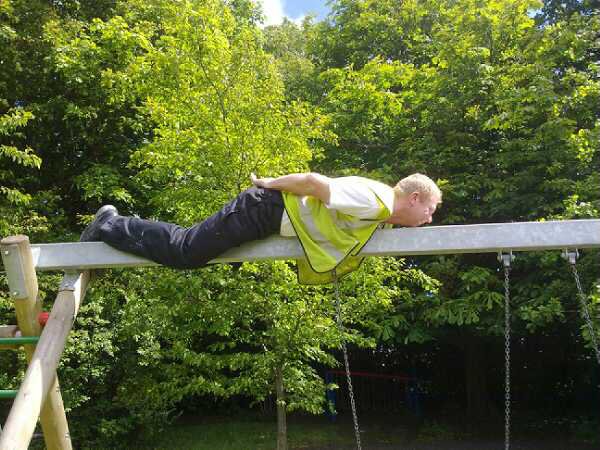 Here we kin see a typically busy Bo'ness workmin takin pairt in the craze it a swingpark near Cumlouden earlier the day.